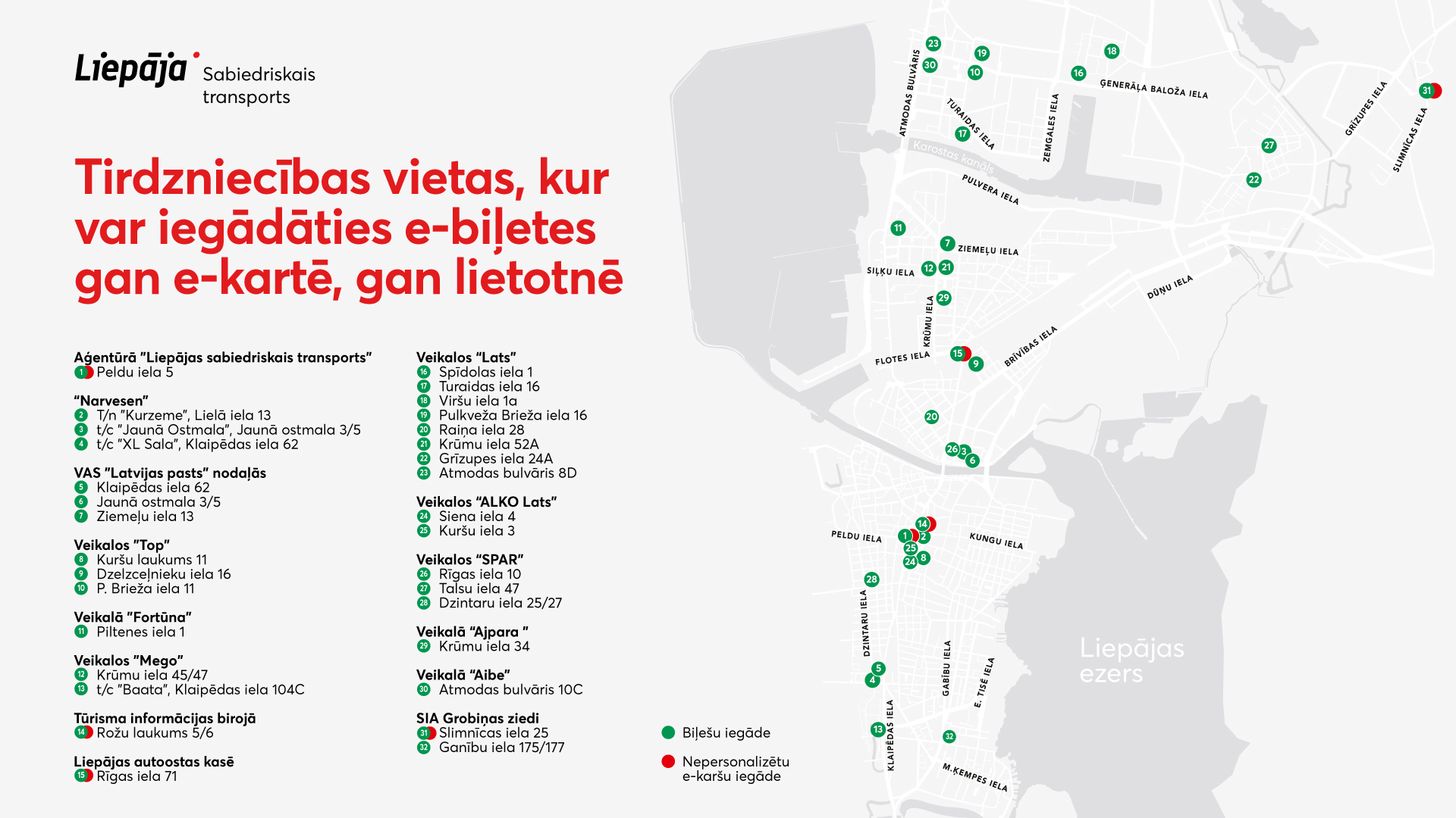 E-karti var iegādāties Liepājas Sabiedriskā transporta kasē (Peldu iela 5), Liepājas tūrisma informācijas birojā (Rožu laukums 5/6), Liepājas autoostas kasē (Rīgas iela 71) un Liepājas reģionālajā slimnīcā, veikalā “Grobiņas ziedi” (Slimnīcas iela 25) šeit.